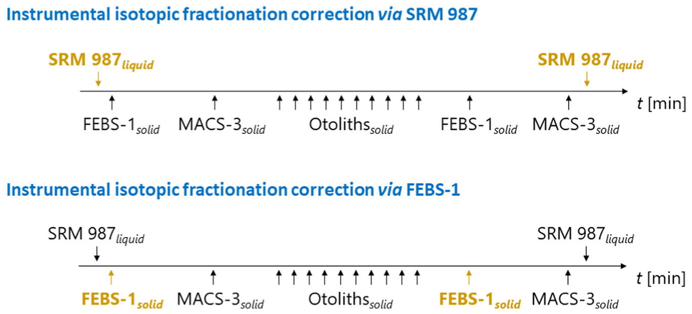 Abstract: The determination of the spatial variation of n(87Sr)/n(86Sr) isotope ratios in calcium carbonates by laser ablation multi collector inductively coupled plasma mass spectrometry (LA-MC-ICP-MS) can support to uncover geological, ecological, or biological processes. This study presents the use of an external matrix matched bracketing standard for the correction of instrumental isotopic fractionation (mass bias) of strontium isotope ratios in natural carbonates determined by LA-MC-ICP-MS. We used a stable, homogeneous and well-characterized reference material, the FEBS-1 otolith powder, pressed into pellets as a matrix matched calibration standard. Pellets were produced without binder by means of a hydraulic press and nano-milling to improve the mechanical stability and homogeneity of the pellet. The methodology was applied to fish otoliths, which represent a typical natural carbonate matrix of high interest. The synthetic carbonate powder MACS-3 pressed into pellets was used as quality control standard. The tested performance indicators of the methodology were robustness, trueness and precision. Using the conventional method up to 20 % of quality control data showed a significant unsystematic bias and all otolith isotope ratio data shifted in comparison to the expected values by up to 0.00068. The novel approach eliminated the unsystematic bias in quality control data and reduced the shift of otolith n(87Sr)/n(86Sr) isotope ratios by up to 100 %, thus significantly improving method robustness and data trueness. The precision of the n(87Sr)/n(86Sr) isotope ratio in the investigated natural carbonates amounted to approximately ± 0.00033 (1 SD) and was comparable to similar experimental studies in this field.