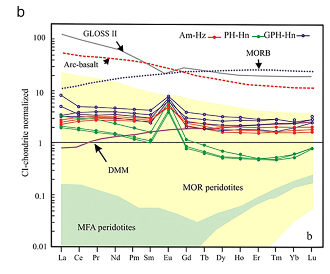 The Orlica-Śnieżnik Dome in the Bohemian Massif represents a key window into the tectonic and geochemical evolution of the Saxothuringian continental crust, exemplified by the stratified Kowadło ultramafic suite. The Kowadło ultramafic exposures are found in gneisses of the Central Sudetes, comprising a lithological sequence from harzburgite to hornblendite, with transitional garnet-bearing varieties. Petrographic, geochemical, mineral chemical, and Sr-O-H isotopic analyses reveal a complex, multi-stage (stages I–V) evolution involving both metasomatic and metamorphic processes. Initial harzburgite crystallized from a high-Mg MORB-like basaltic melt, as indicated by Cr-spinel compositions (Cr# = 0.27–0.44) and low initial ⁸⁷Sr/⁸⁶Sr ratios (0.70274–0.70285). Subsequent infiltration of hydrous, Al-rich tholeiitic melts triggered amphibole formation and the growth of metasomatic spinel (pleonaste-hercynite) and garnet. Progressive metamorphism led to amphibole overprinting, garnet recrystallization, and the development of corundum through the oxidation of spinel. Stable isotopic compositions (δ¹⁸O = 5.64–5.72‰; δD = –89.1 to –68.2‰) suggest interaction with melts from metasomatized mantle domains and later hydrothermal fluids. Thermodynamic modeling constrains these processes to pressures of 7–13 kbar and temperatures up to 1250°C, followed by retrograde and prograde metamorphism. These results provide new insights into crust–mantle interactions, fluid–rock metasomatism, and the geodynamic evolution of the Saxothuringian domain during the Variscan orogeny.